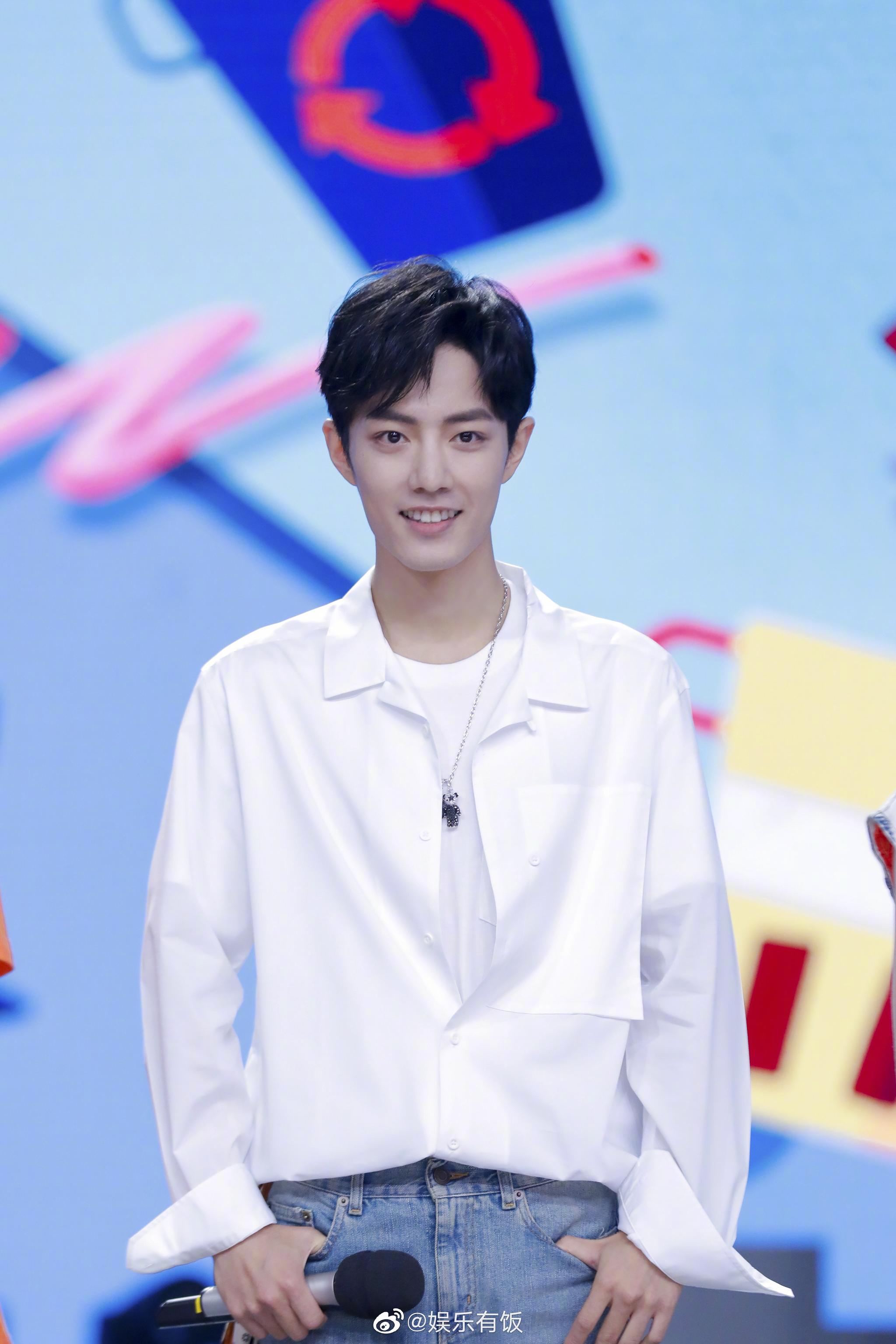 他来了!今晚的快乐大本营肖战来了!一身白衬衫加牛仔裤