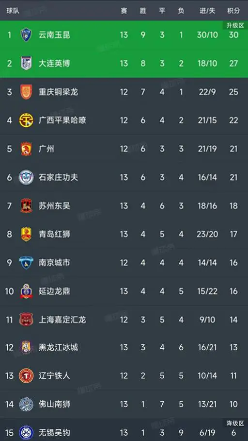 中甲13轮战前最新积分榜:云南27分第1,重庆第2把交椅,大连第3