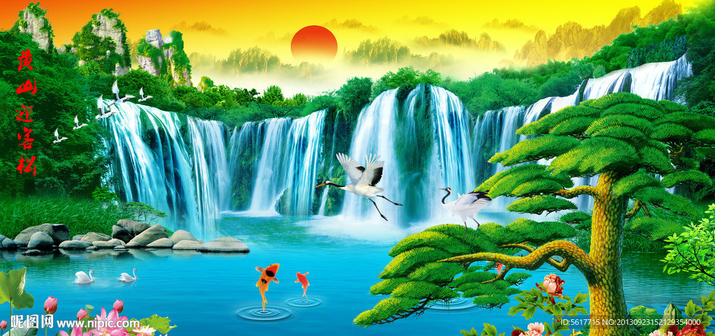 大瀑布流水生财招财风水画迎客松山水画松鹤延年太阳壁画墙贴