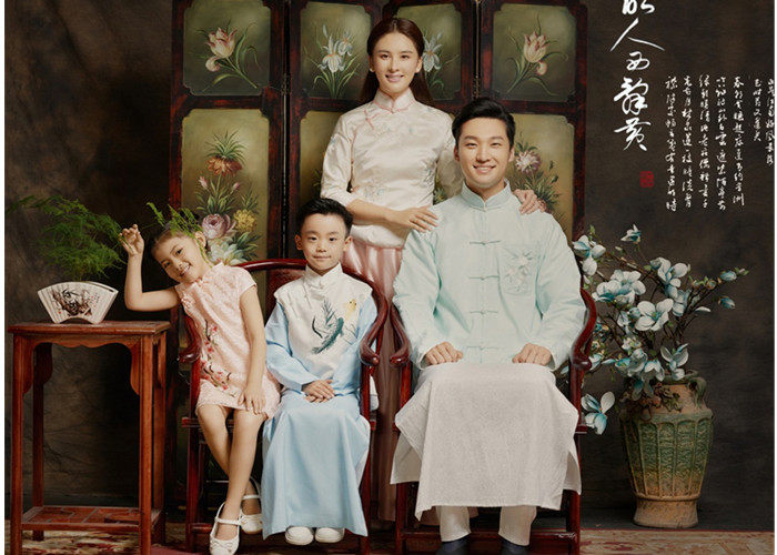 2019展会新款影楼亲子摄影写真服装 民国风工笔画一家四口全家福