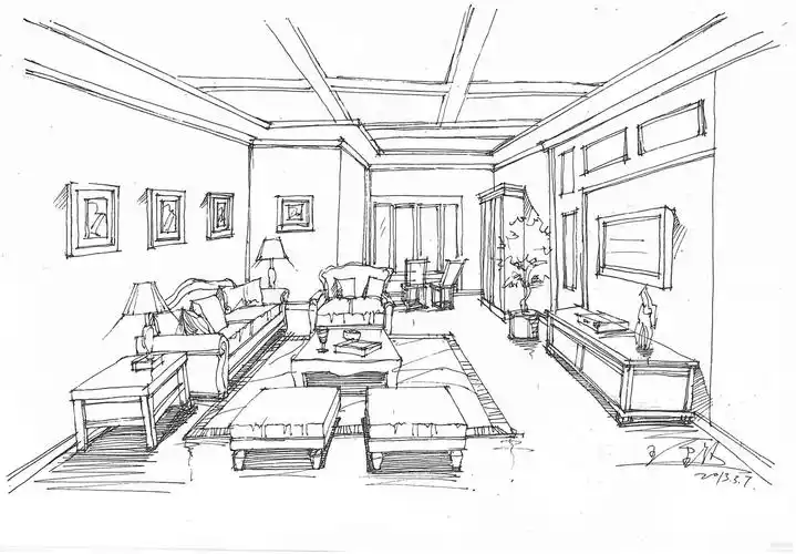 带沙发架桌子的家具轮廓草图. 客厅图纸设计. 雕刻手绘插图