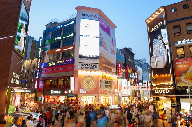 傍晚的明洞商业街,簇拥着的店面,熙熙攘攘的人群,还没完全黑下来的天