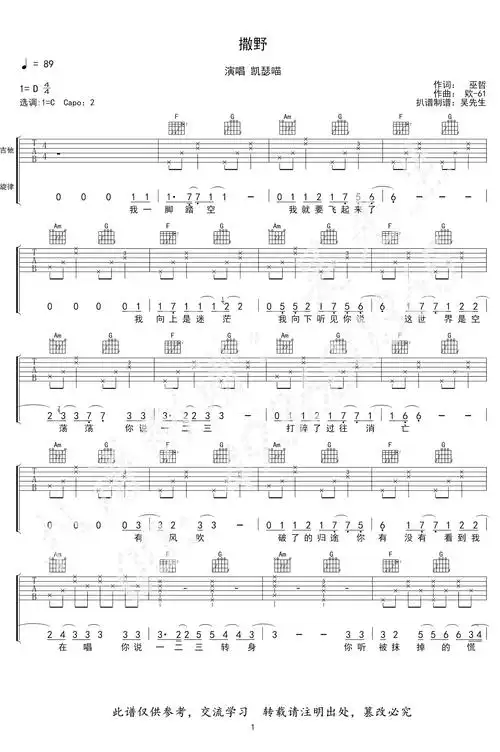 撒野-凯瑟喵 原版吉他弹唱d调六线吉他谱-虫虫吉他谱免费下载