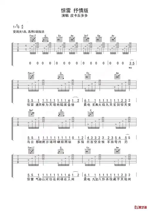 惊雷吉他谱皮卡丘多多c调抒情版弹唱六线谱