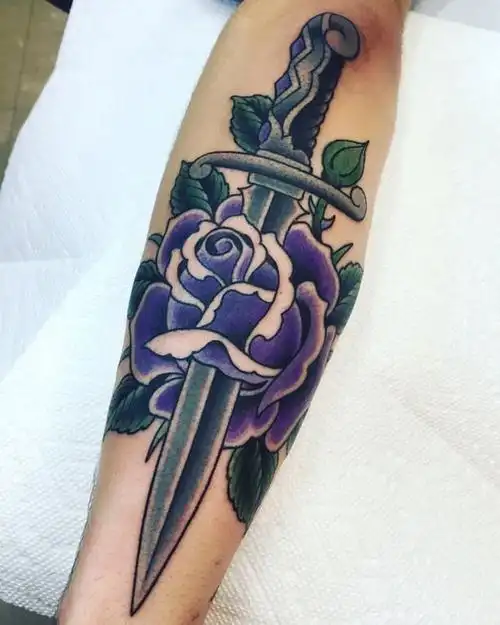 男生手臂上彩绘水彩素描创意文艺花朵匕首纹身图案