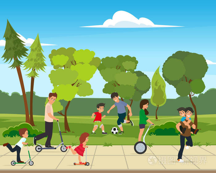 公园一角骑自行车散步遛狗的人群扁平插画png图片免抠矢量素材