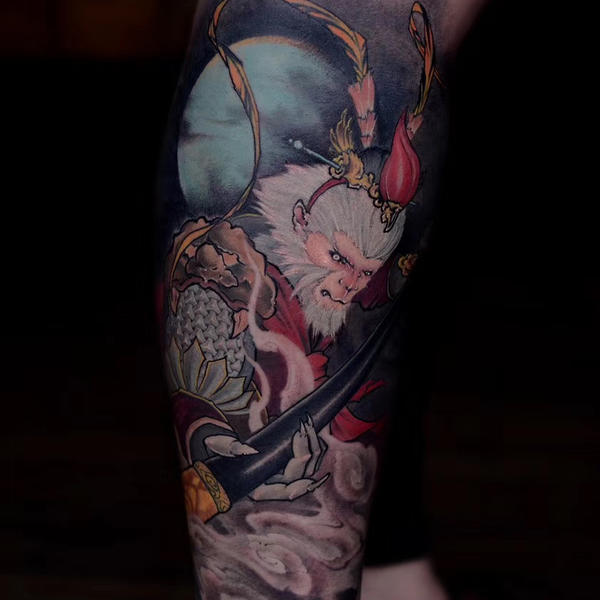 齐天大圣纹身图片_成品腿部传统人物齐天大圣纹身图案
