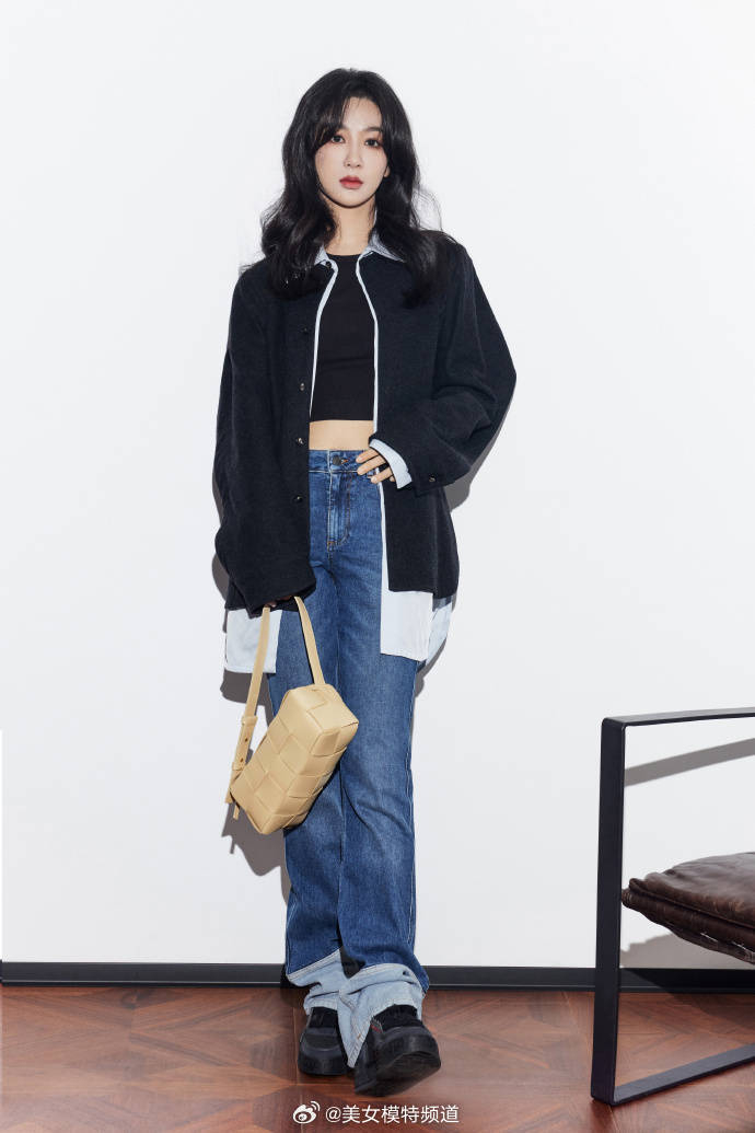 杨紫黑色外套搭牛仔裤酷飒十足露腰线诠释穿搭时尚