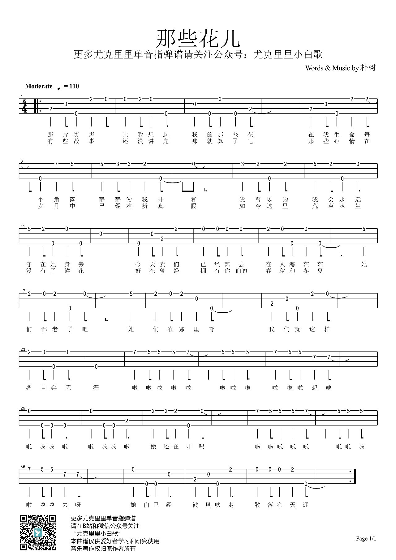 那些花儿尤克里里谱单音指弹独奏谱小白歌