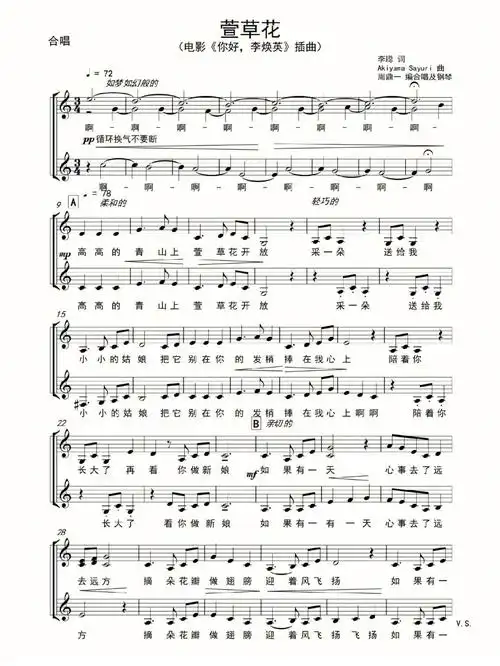天使童声合唱团 - 萱草花 纯音乐伴奏 合唱谱简谱钢琴五线谱正谱