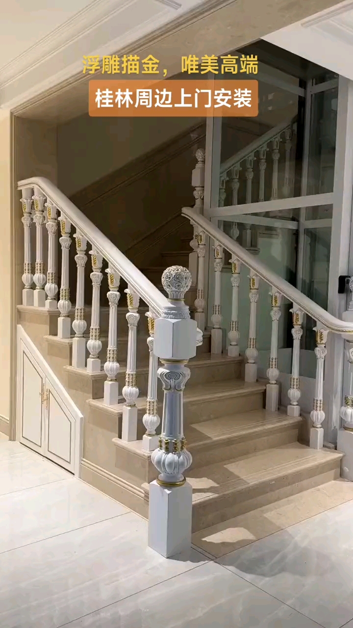 漂亮的实木楼梯扶手:浮雕白色描金