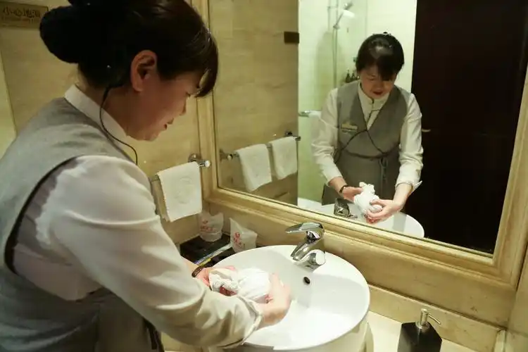 汉南绿地铂瑞酒店服务员,正在房间内进行细致的工作