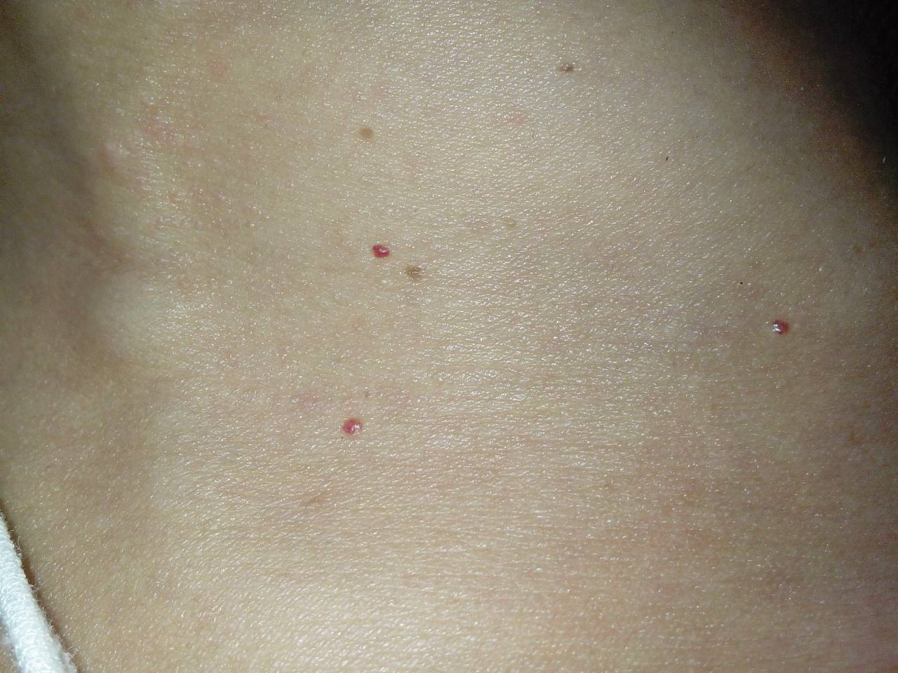 去年开始,我脖子周围长了好几颗红点,不痛也不痒,我女儿右肩上也长