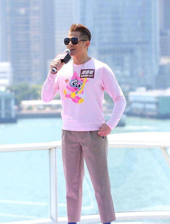 当天郭富城身穿一件白色polo衫,搭配竖条纹灰色西装裤,整体看起来潇洒