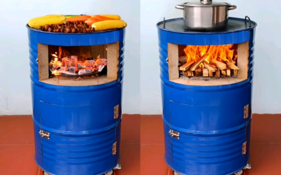 农村小伙用废弃油桶改造多功能柴火炉,煮饭的同时还能烧水