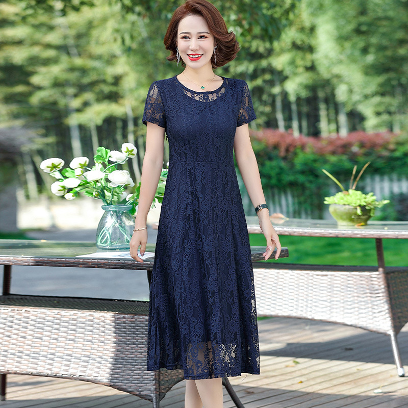 妈妈气质连衣裙中年女夏装新款40岁50高贵纱网中老年短袖过膝裙子