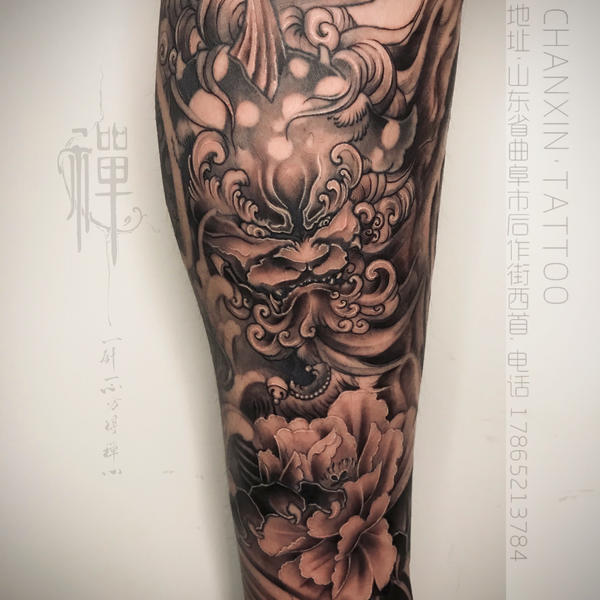 小腿外侧 黑灰骷髅 牡丹_纹身图案手稿图片_皮肤雕刻师强哥的纹身作品