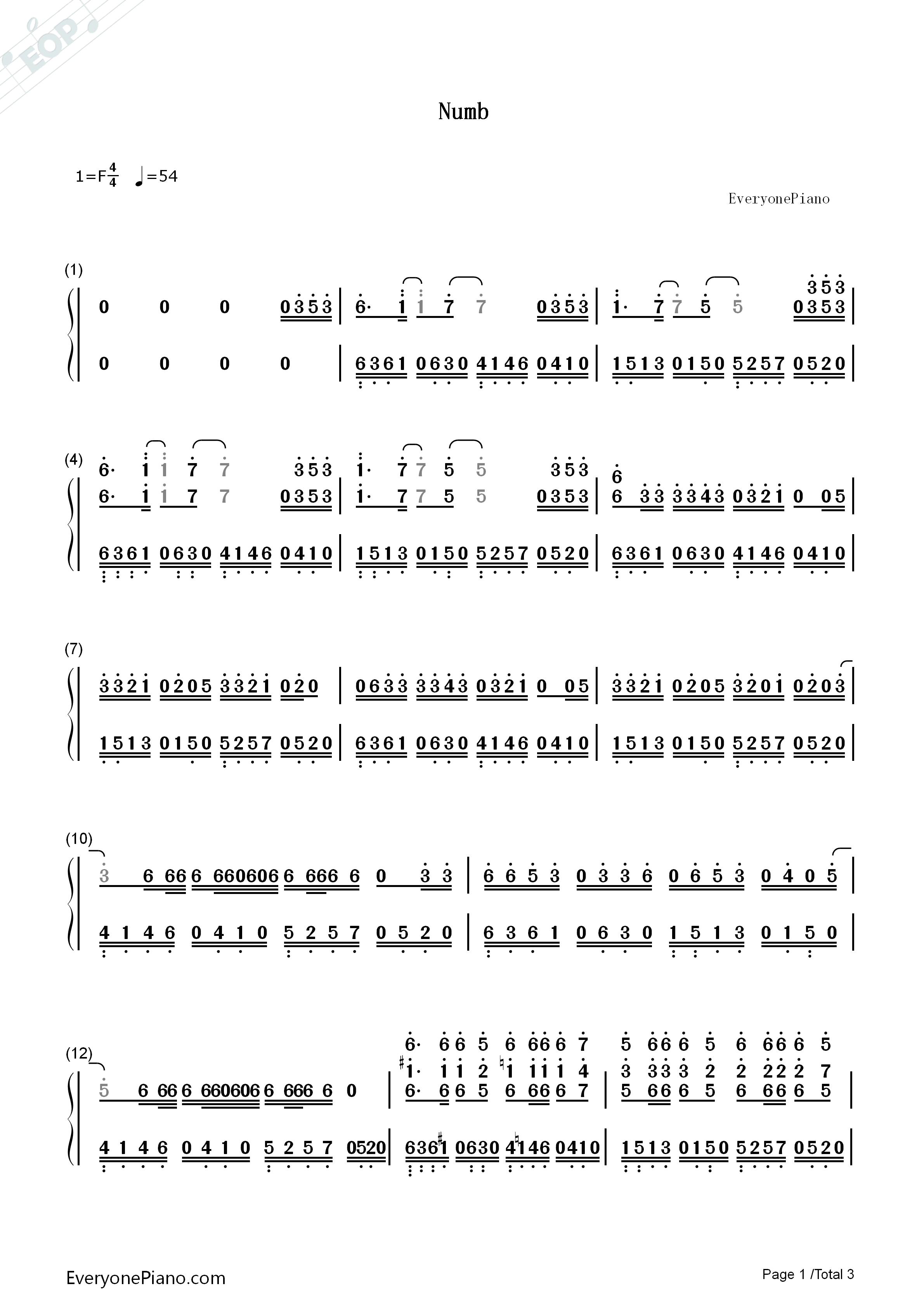 numb钢琴谱_linkinpark林肯公园_麻木_linkinpark-明明简谱网