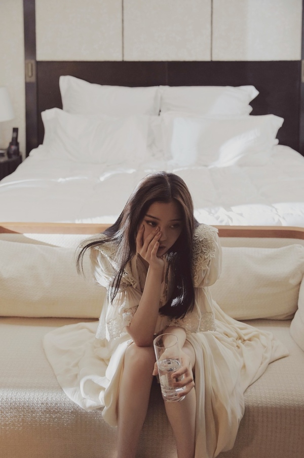 欧阳娜娜纯欲风写真 穿白色睡裙发丝凌乱显慵懒