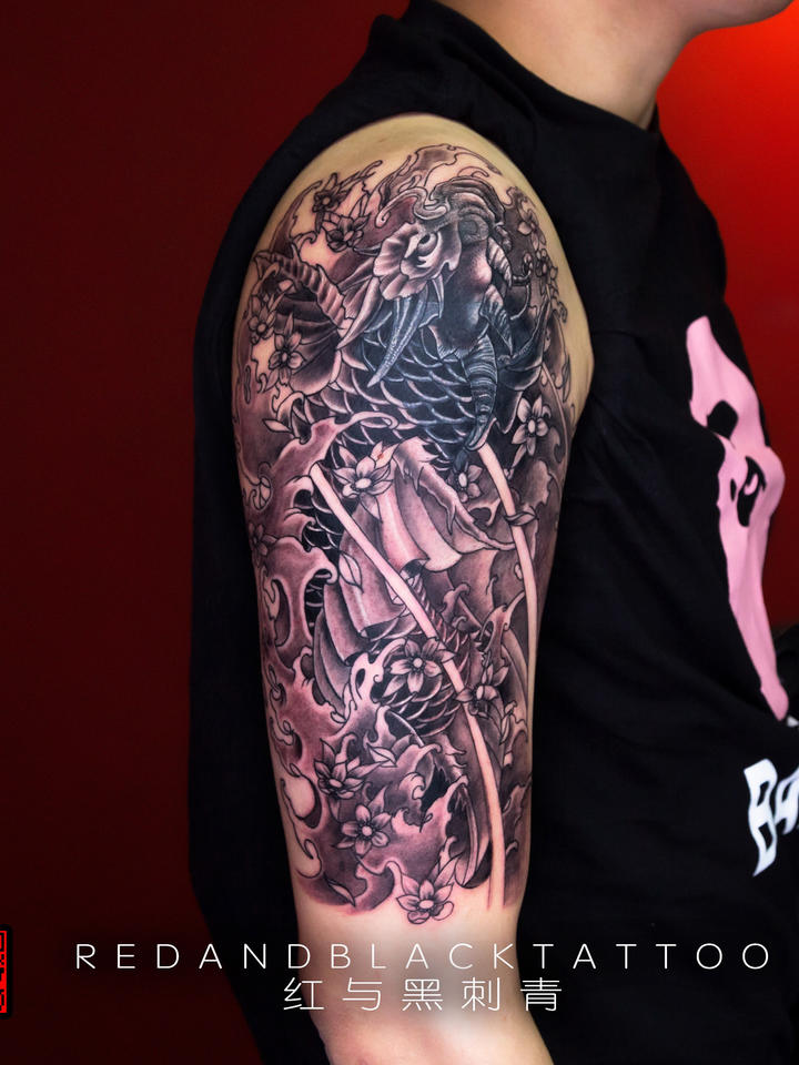 遮盖半臂_纹身图案手稿图片_红与黑菠萝的纹身作品集