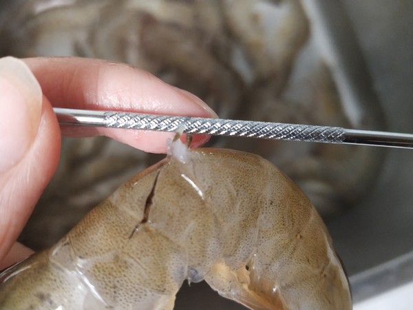第1步,新鲜的活虾剪去头部的虾枪.