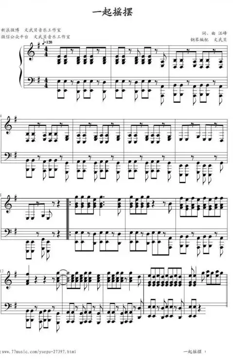 钢琴谱 - 一起摇摆(汪峰劲爆单曲)