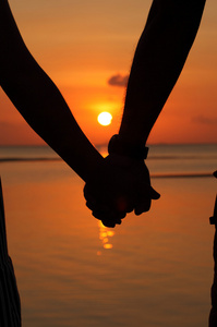 牵手的情侣剪影和夕阳