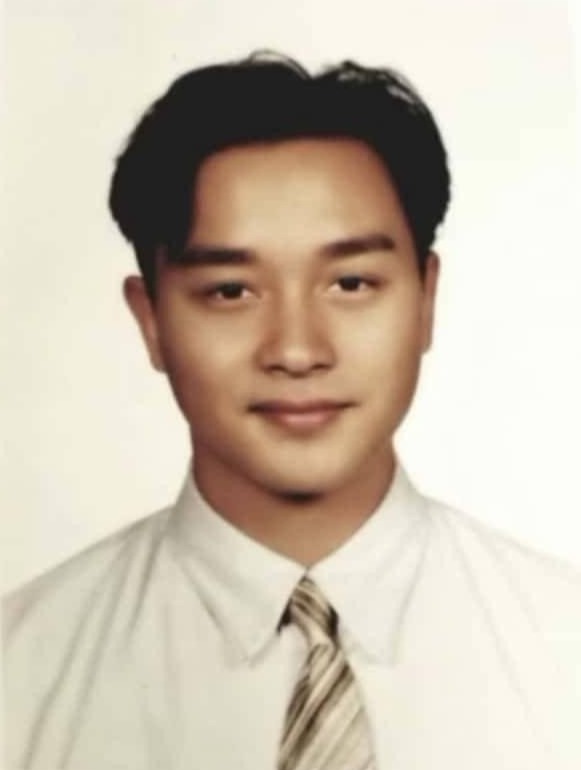 张国荣,年轻时的照片中,他穿着一件黑色中山装,目光清澈明亮,面容端庄