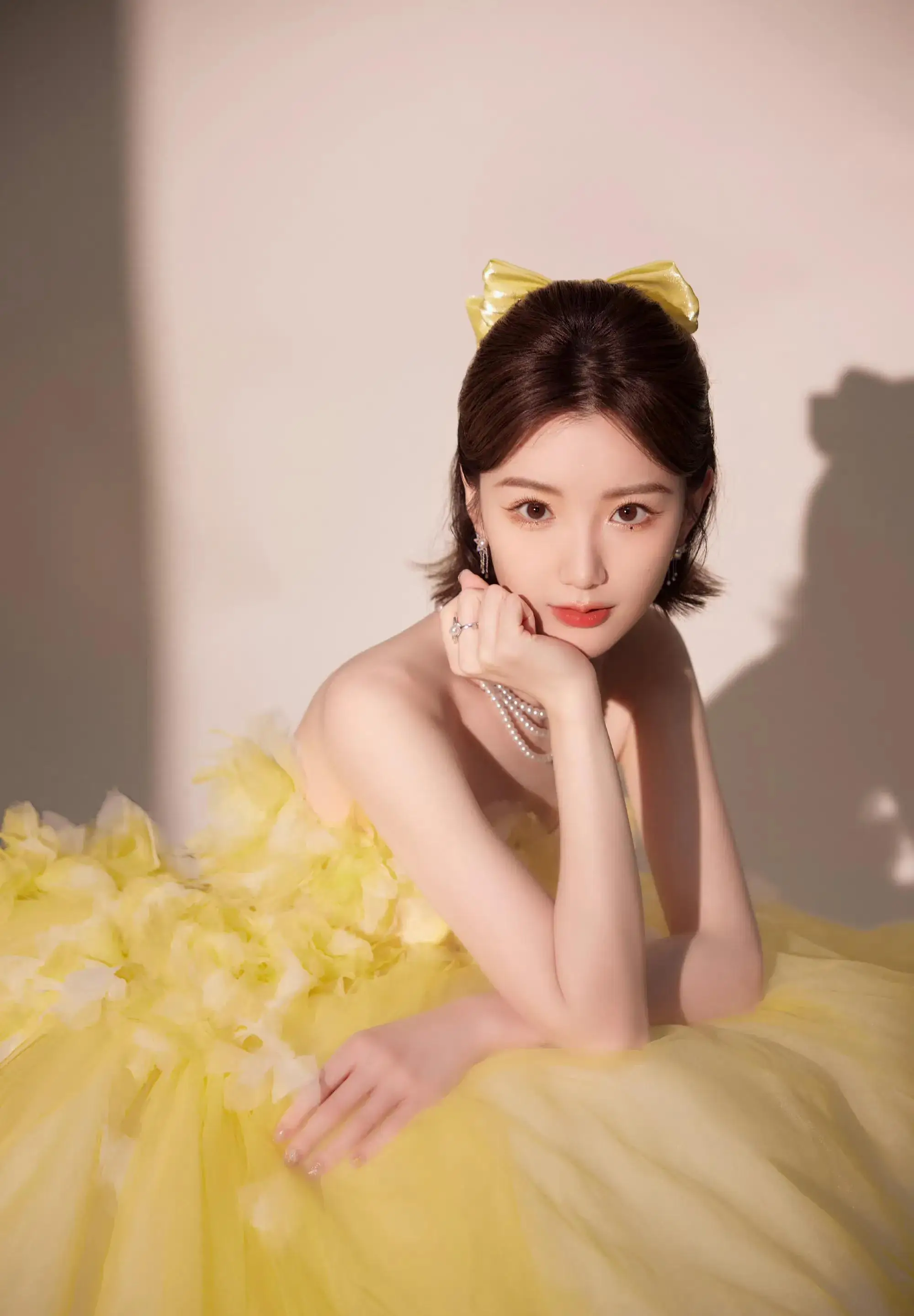 毛晓彤穿黄色花朵抹身材蓬蓬裙 明艳靓丽 俏皮可爱 露香肩雪肤甜美动