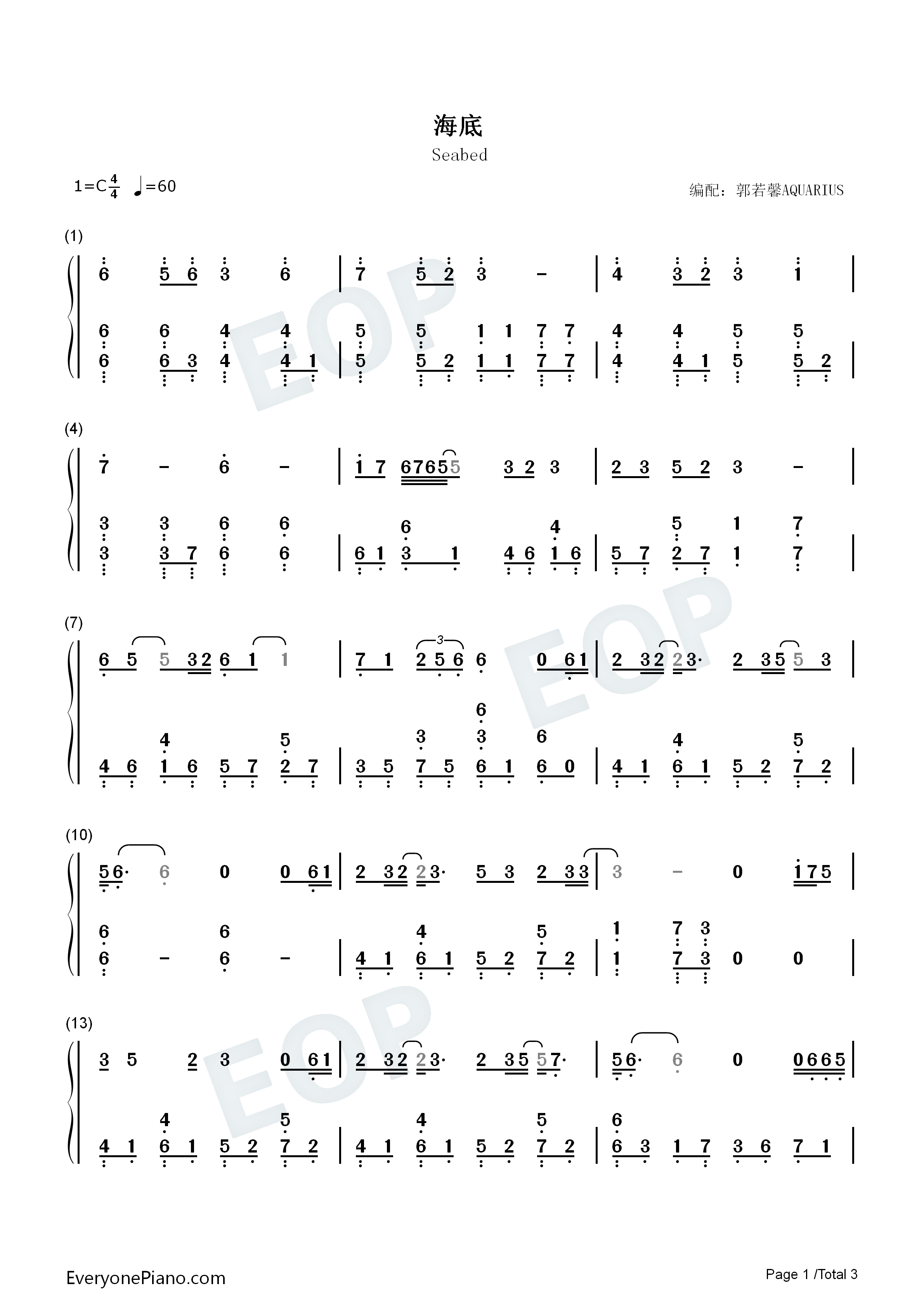 海底-完美版双手简谱预览1-钢琴谱文件(五线谱,双手简谱,数字谱,midi