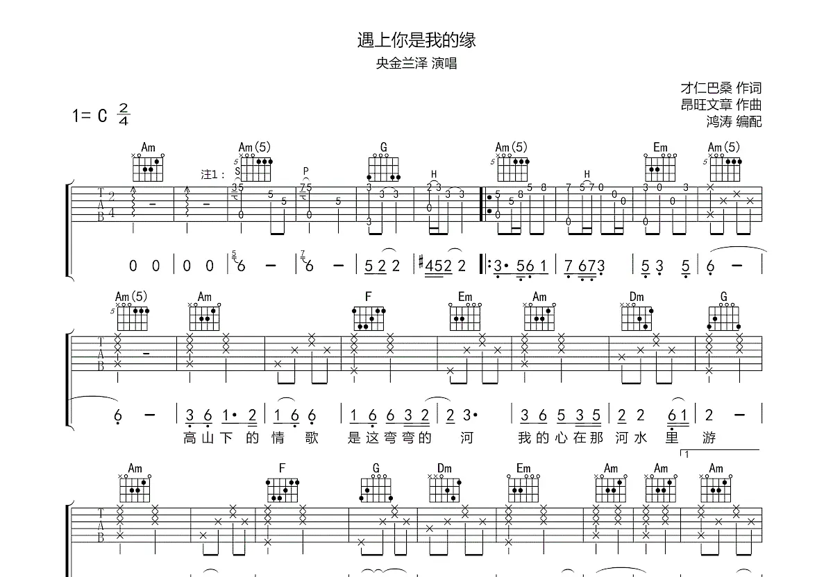 遇上你是我的缘吉他谱_央金兰泽_c调弹唱吉他谱82%原版 - 吉他世界