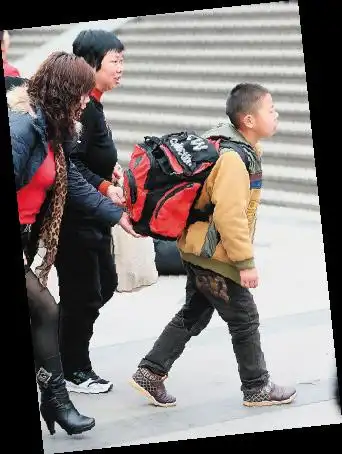 一名母亲托住孩子的沉重背包,以减轻他背负的重量.生活报记者 周军摄