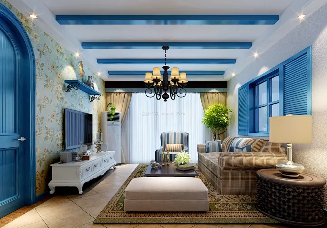 复古美式客厅落地窗彩虹吊顶装饰效果图4/5