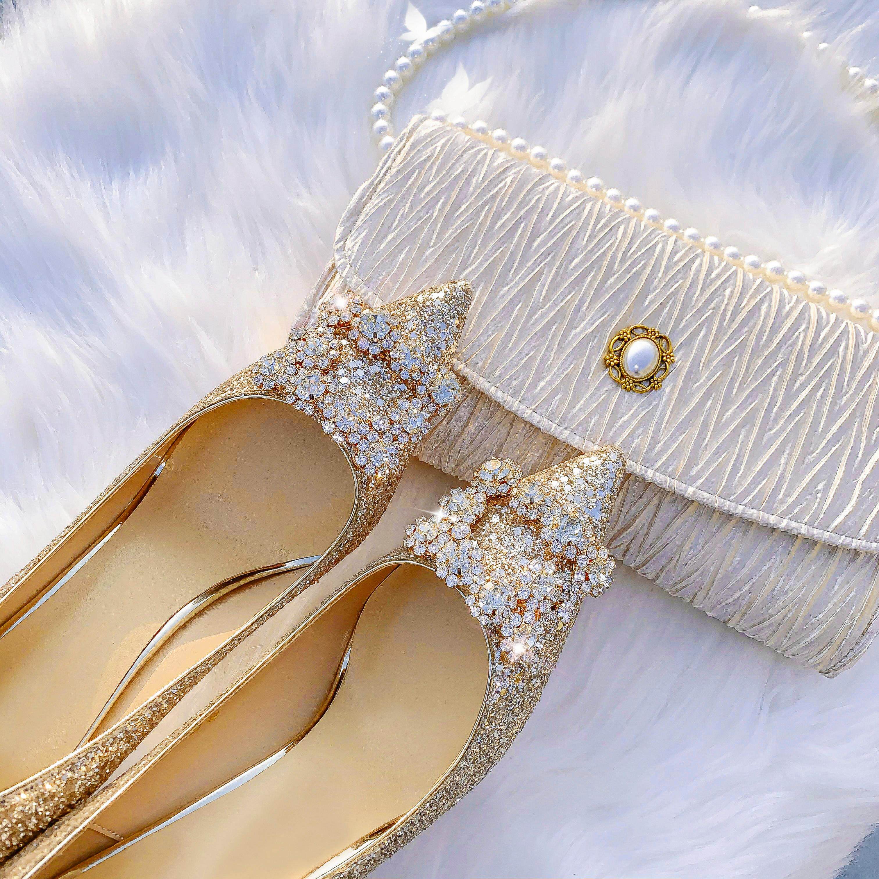 法式重工蝴蝶结婚鞋水晶鞋新款仙女风高跟鞋女细跟主婚纱闪亮名媛