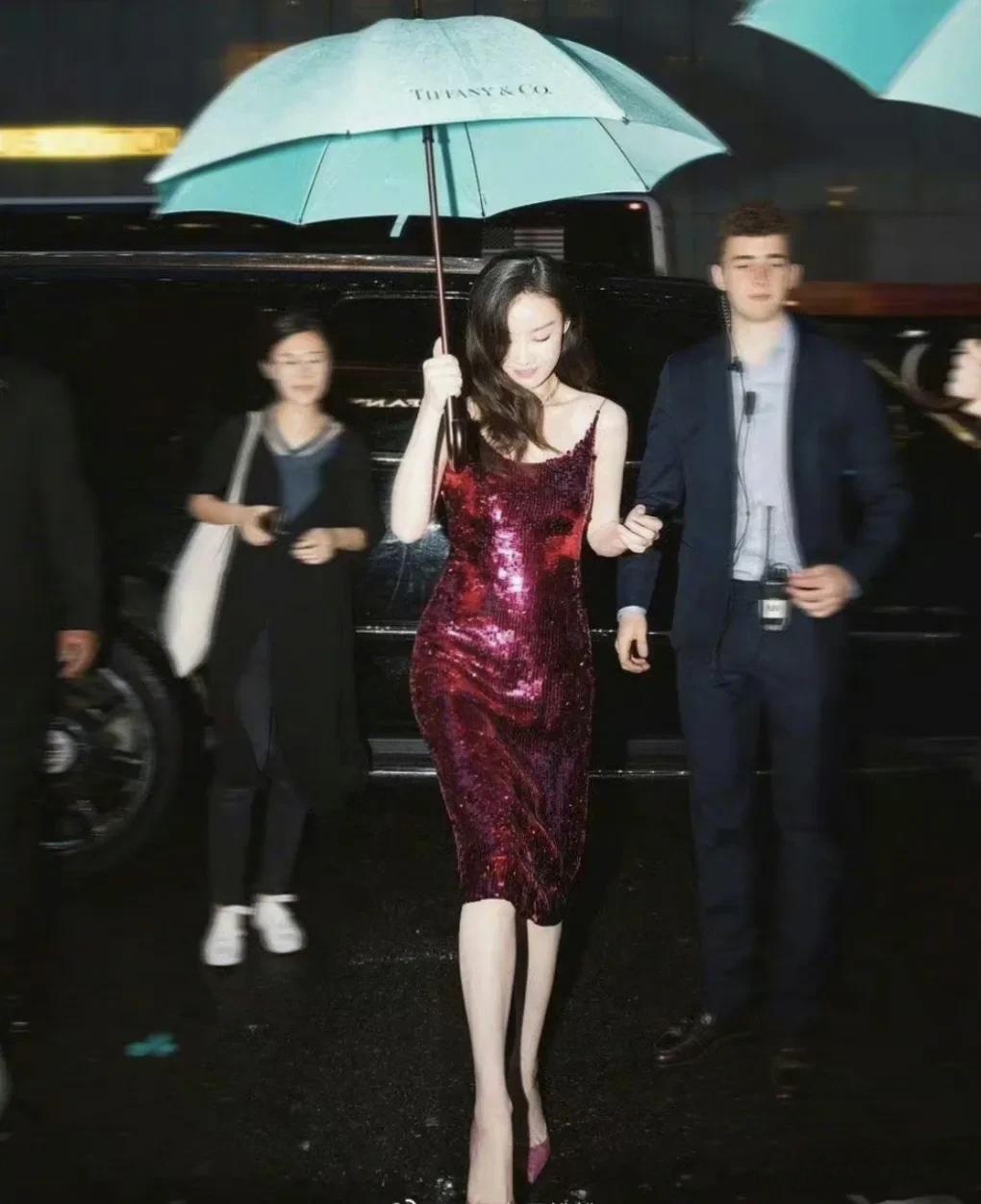 倪妮雨中撑伞成神图,红色亮片吊带裙太惹眼!