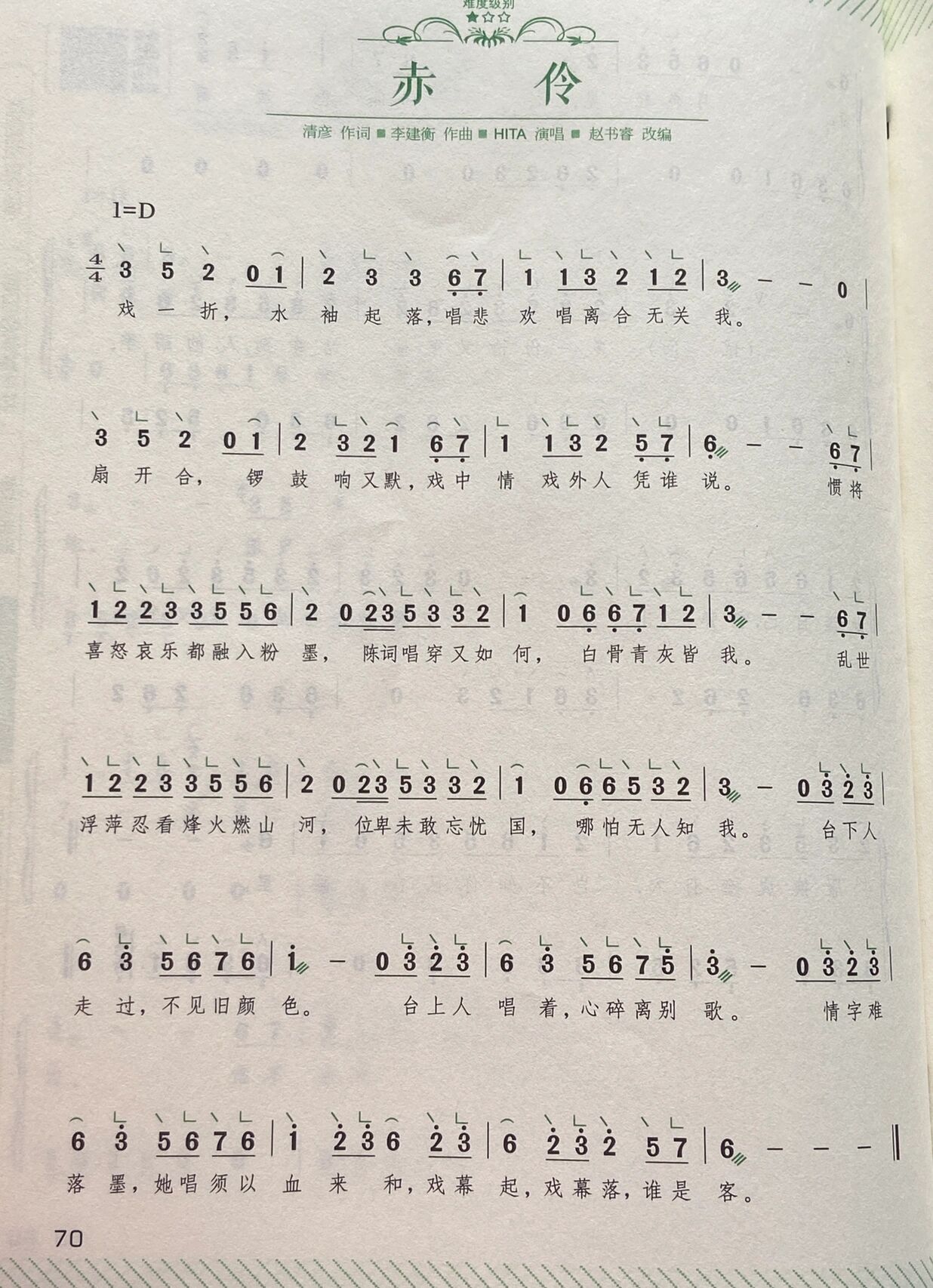 赤伶简谱-hita演唱-李建衡/清彦词曲1