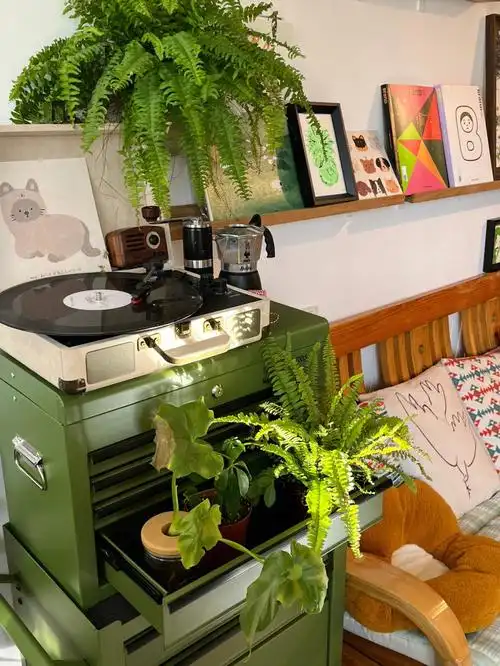 78整个室内空间我们选得是墨绿色和黑色做搭配,暖黄色灯光,金属配饰