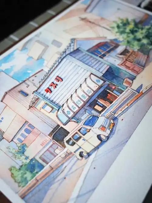 钢笔淡彩东京老铺日式街景水彩步骤图