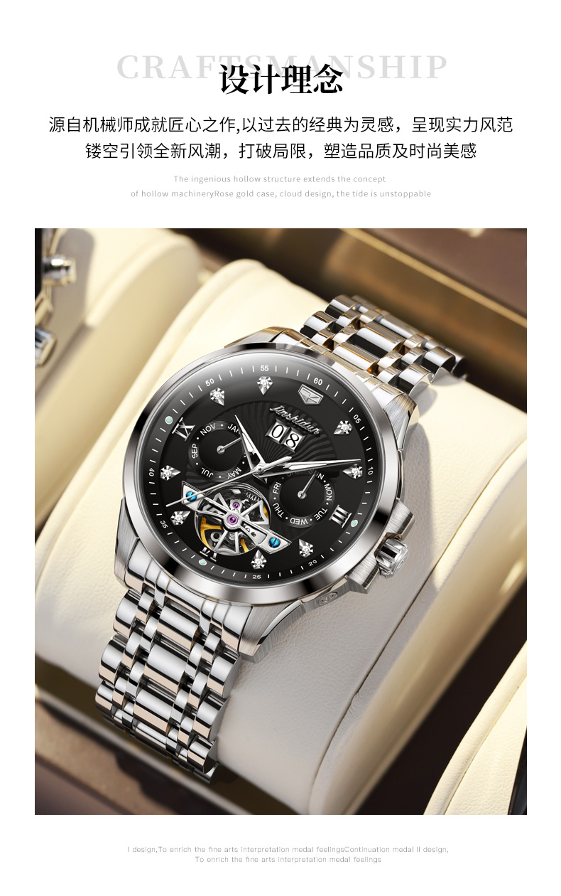 欧绮娜品牌男士全自动机械手表夜光透底钢带手表腕表男特价促销款