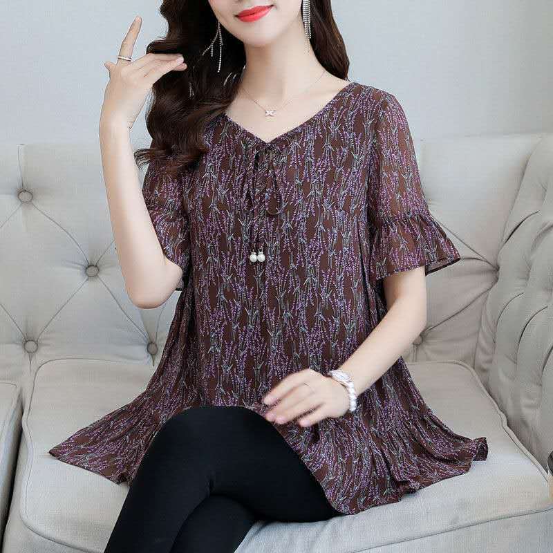 宽松大码春夏季碎花雪纺衫喇叭袖女印花中长款七分袖中袖女装上衣_7折