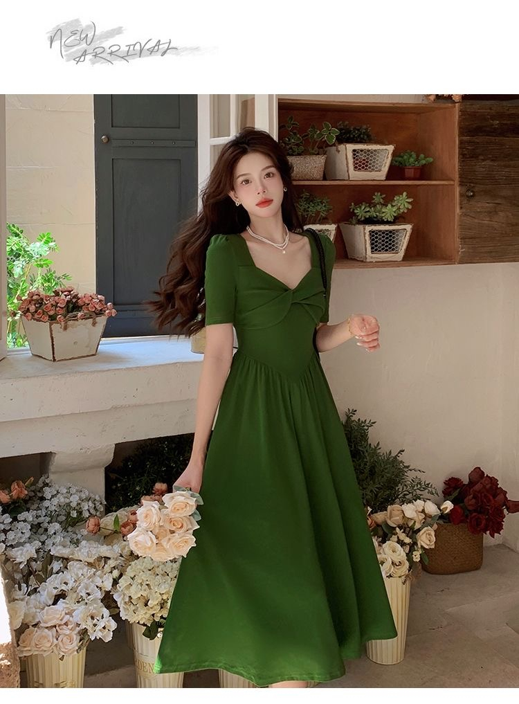 法式高级感温柔风绿色连衣裙女夏季新款复古气质轻熟风短袖长裙