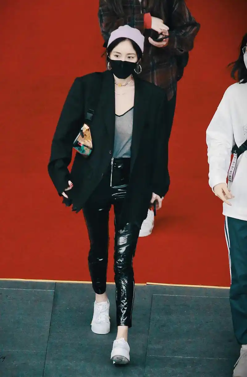 杨幂机场街拍,黑色西服搭配黑色漆面皮裤,名副其实的时尚女王