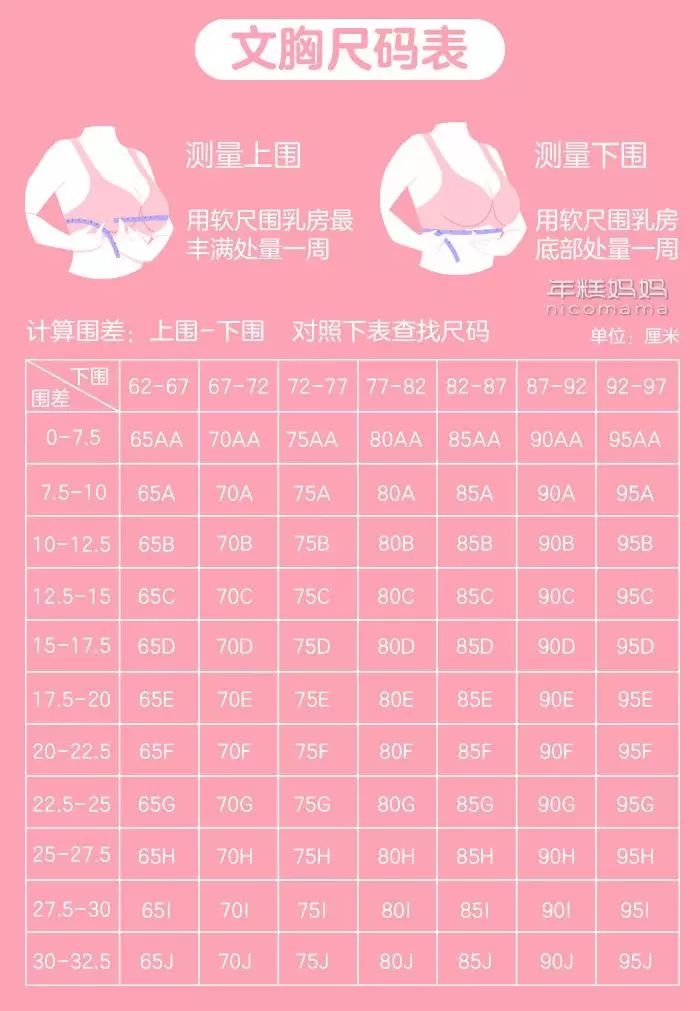 文胸尺码对照表 文胸尺码:把软尺放在乳房下围,绕过身体一周,所得的