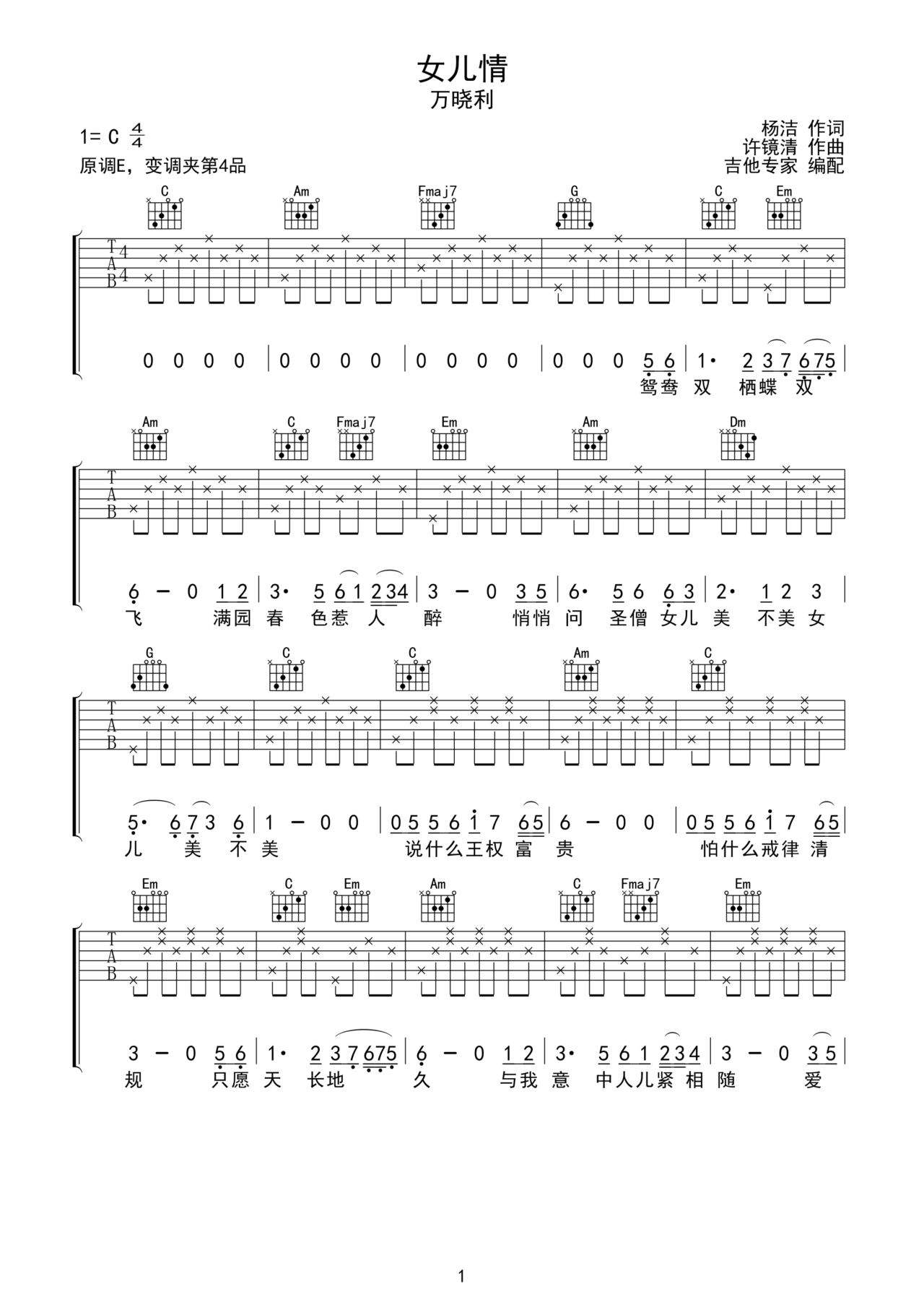 女儿情吉他谱 c调曲谱图片第1张