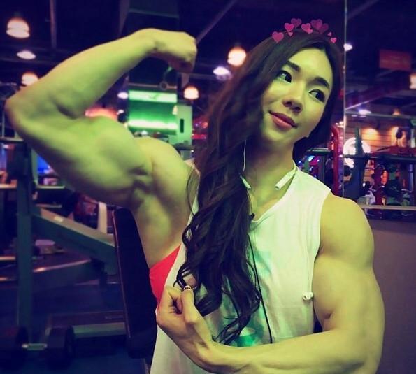 里展示她的肱二头肌,由于女性荷尔蒙的原因,女性的肌肉要比男人的难练