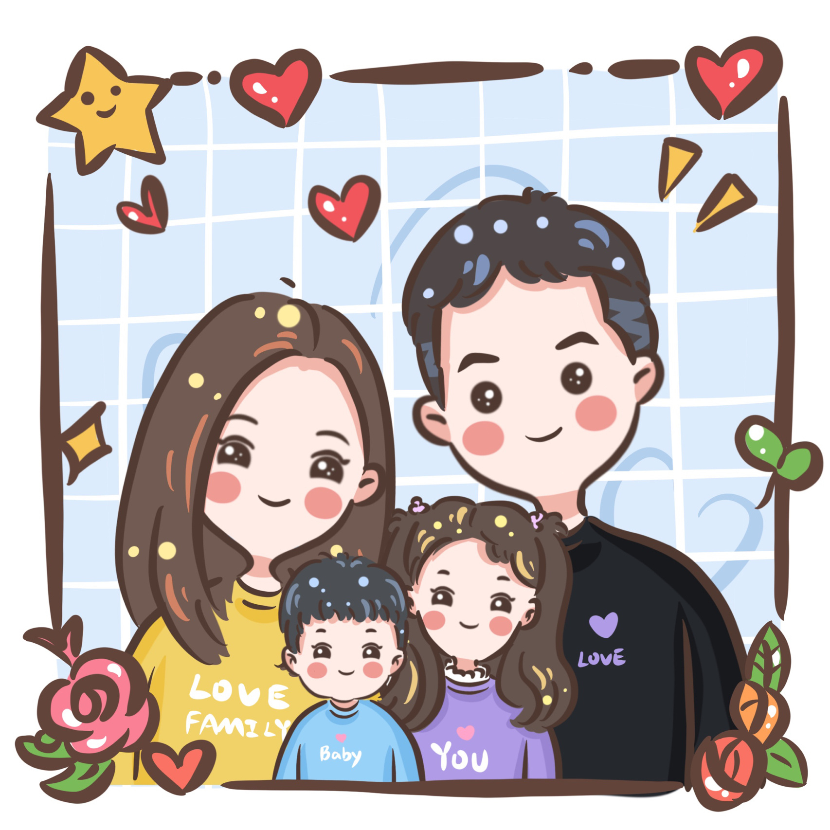 全家福插画合集|亲子插画 照片转手绘~ 一家四口,整整齐齐