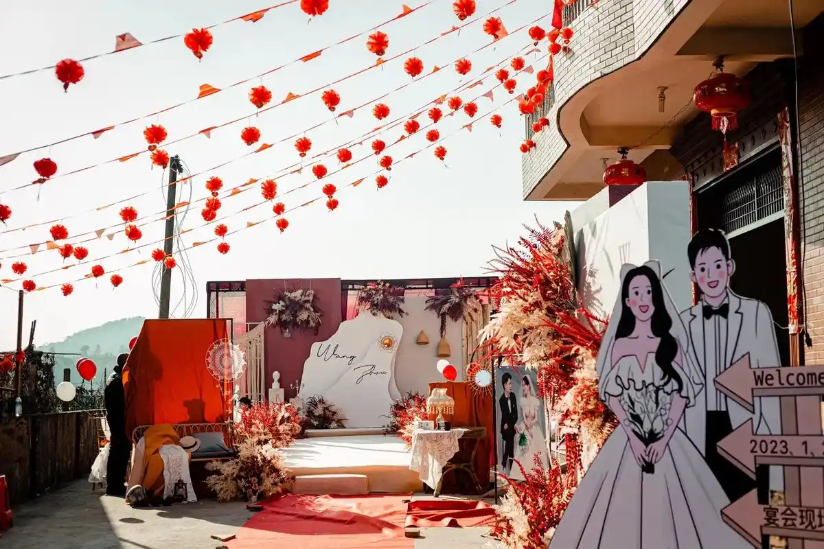 红白色农村庭院婚礼