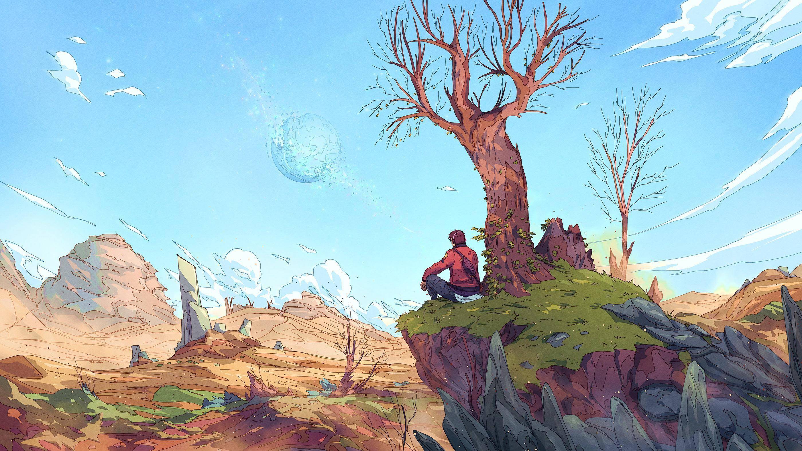 海边的小镇坐在屋顶的女孩唯美动漫风景壁纸壁纸