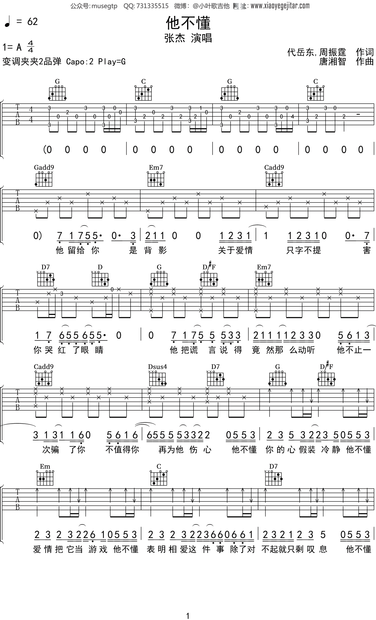 他不懂吉他谱张杰g调高清弹唱谱