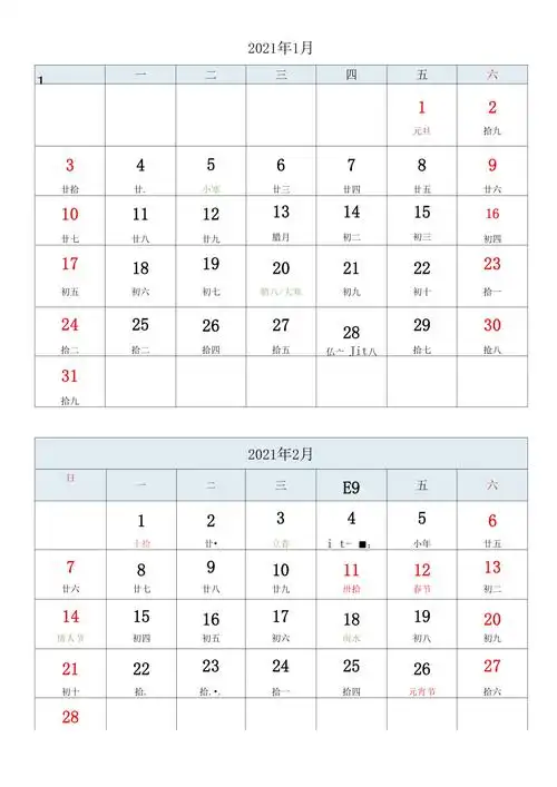 2021年月历a4打印版